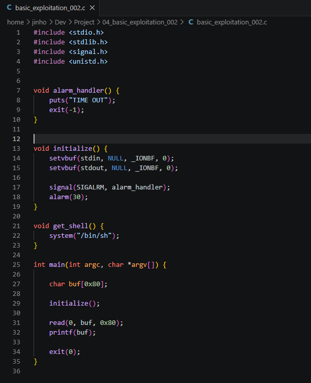 # get_shell은 main에서 호출되지 않지만 바이너리에 컴파일되어 있음