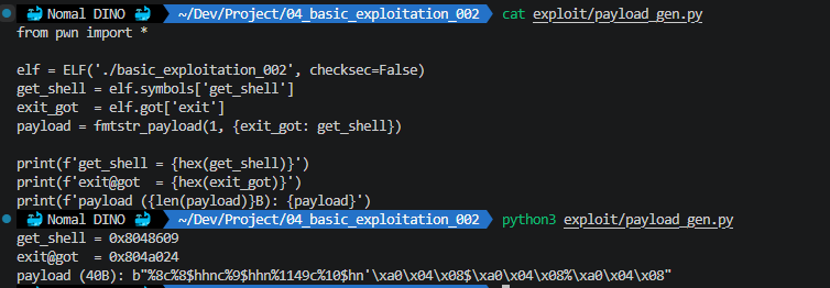 | 페이로드 | fmtstr_payload(1, {exit_got: get_shell}) → 40바이트 |
