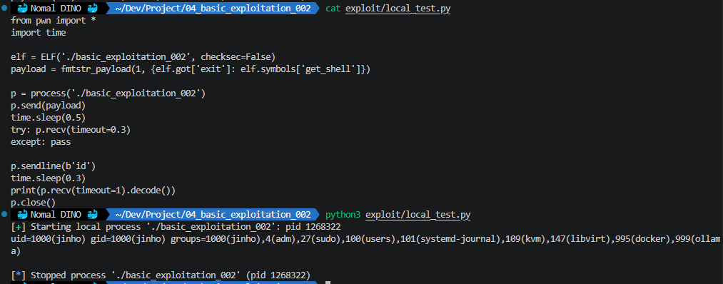 id가 떴다. 로컬 셸 획득. GOT 덮어쓰기가 제대로 동작한다는 증거다.