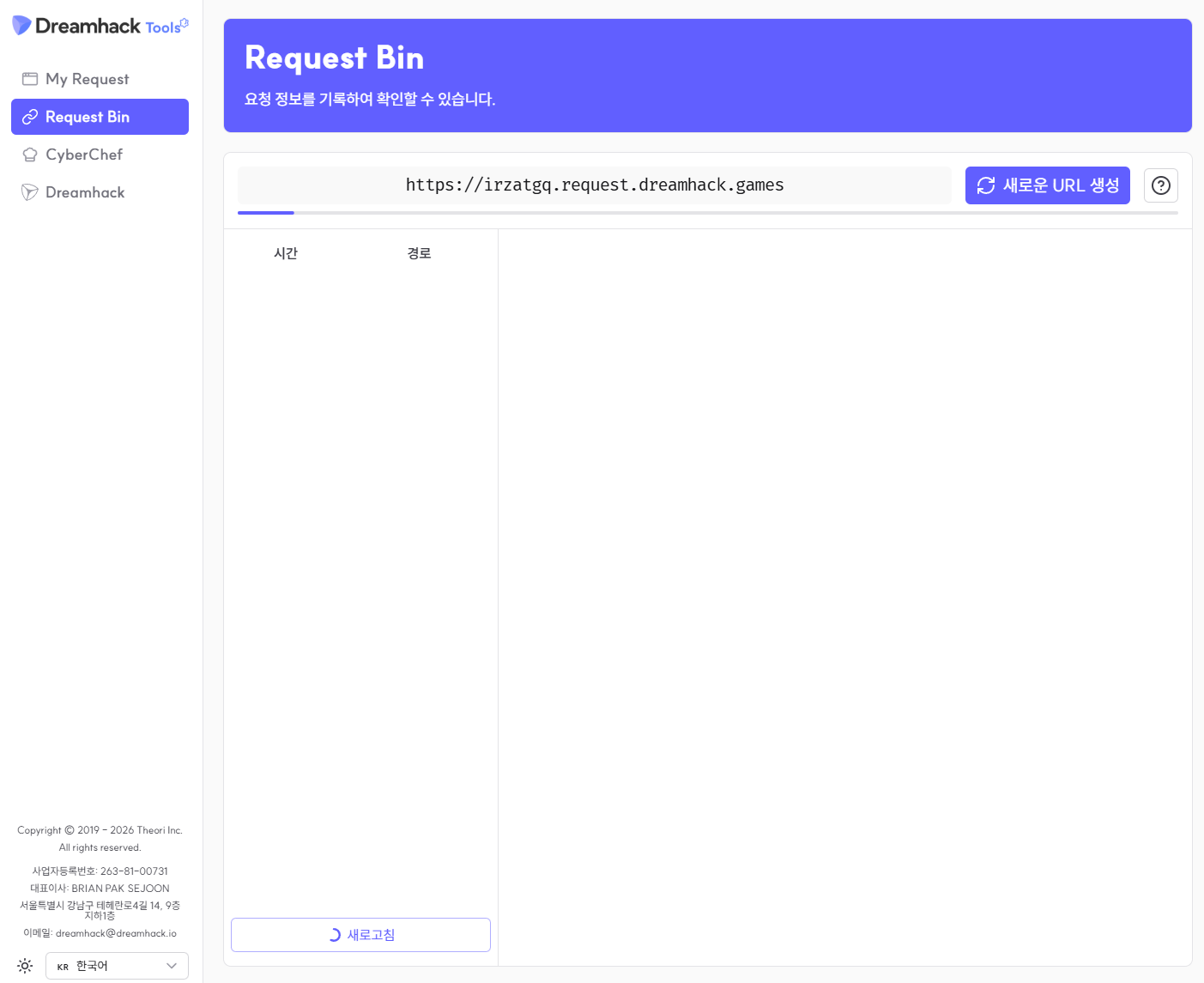 이 문제에서는 webhook.site를 사용했다 (API 기반 자동화가 더 편리). 하지만 수동 풀이에서는 DreamHack RequestBin만으로도 충분하다: