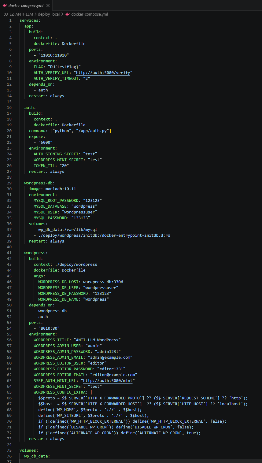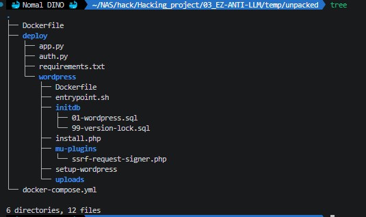 deploy/app.py (FLAG 보유 Flask 앱 — SSRF 실행점)auth.py (토큰 mint/verify 서비스)requirements.txtwordpress/Dockerfileentrypoint.shinstall.phpsetup-wordpressinitdb/01-wordpress.sql99-version-lock.sqlmu-plugins/ssrf-request-signer.php ← 핵심 취약점!uploads/