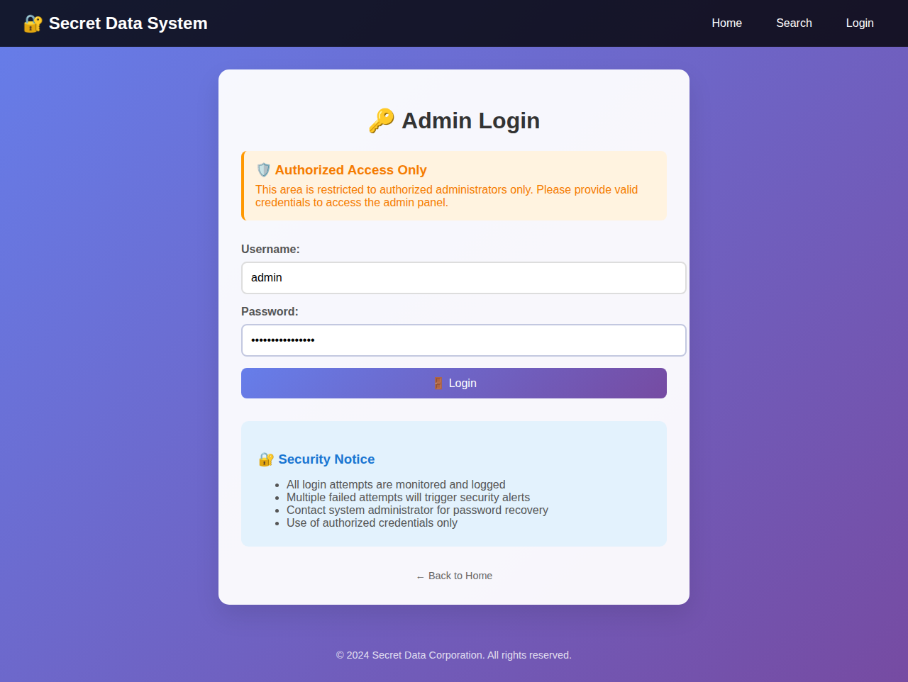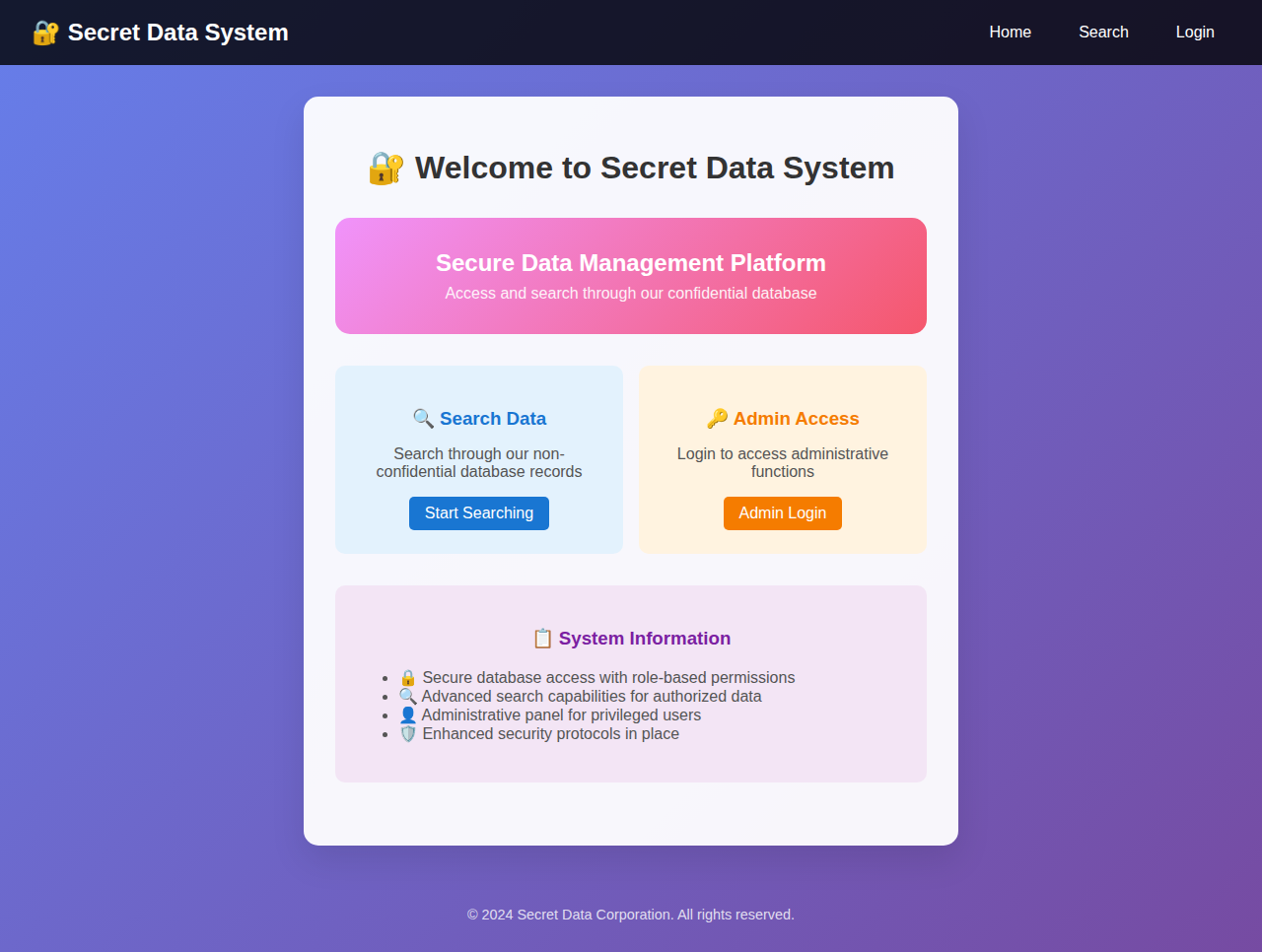 상단 내비게이션에 Search와 Admin Login 두 진입점이 보인다. Search가 외부에 노출된 유일한 입력 포인트다.