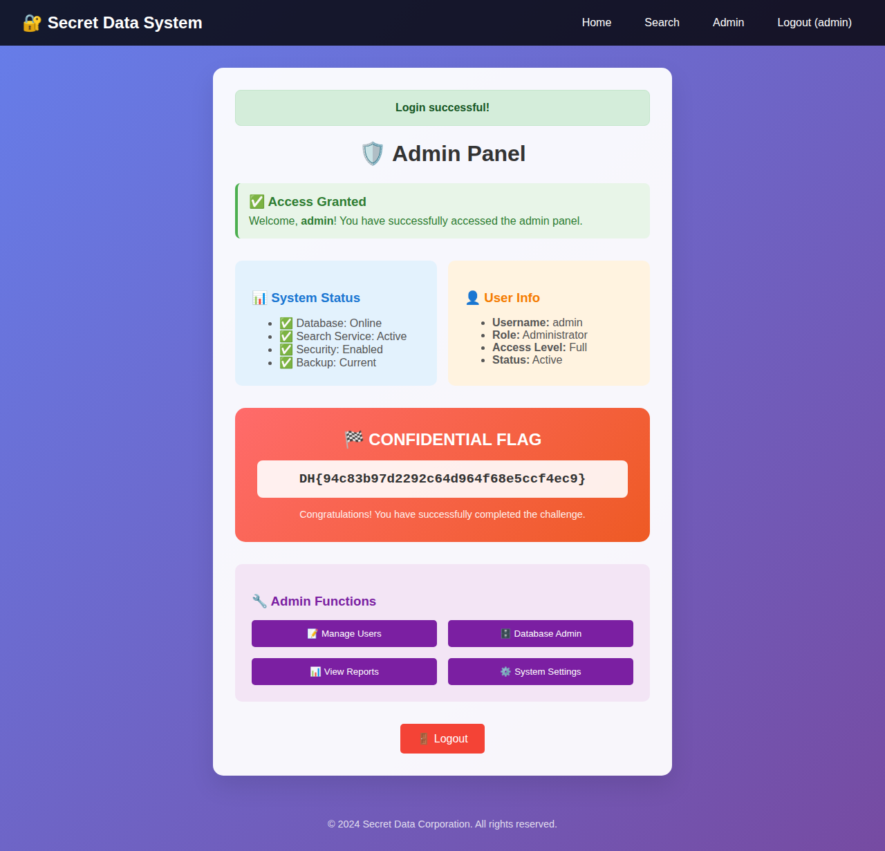 로그인 직후 Admin Panel로 리다이렉트되며 CONFIDENTIAL FLAG 섹션에 플래그가 표시된다.