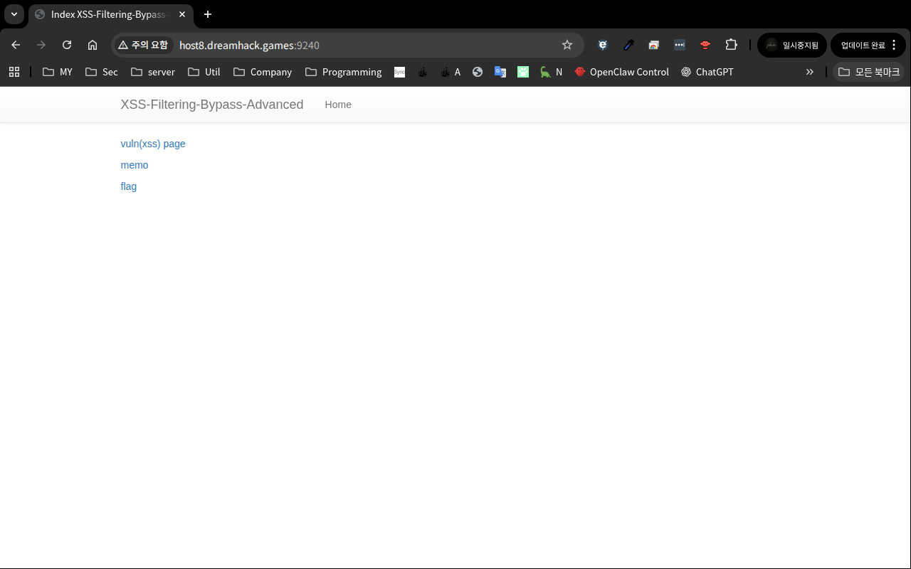 메인 페이지에 세 개 링크가 있다: vuln(xss) page, memo, flag. 각 링크가 어떻게 생겼는지 간단히 살펴봤다.