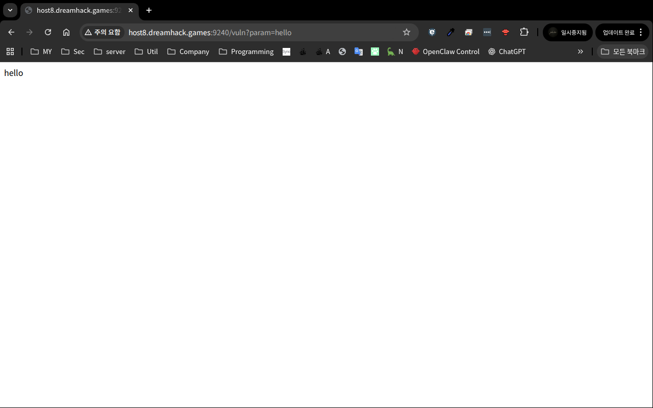 param=hello처럼 일반 텍스트를 넣으면 그대로 화면에 출력된다. 필터 통과 여부와 상관없이 /vuln이 param을 HTML에 그냥 박는 구조라는 게 바로 보인다.