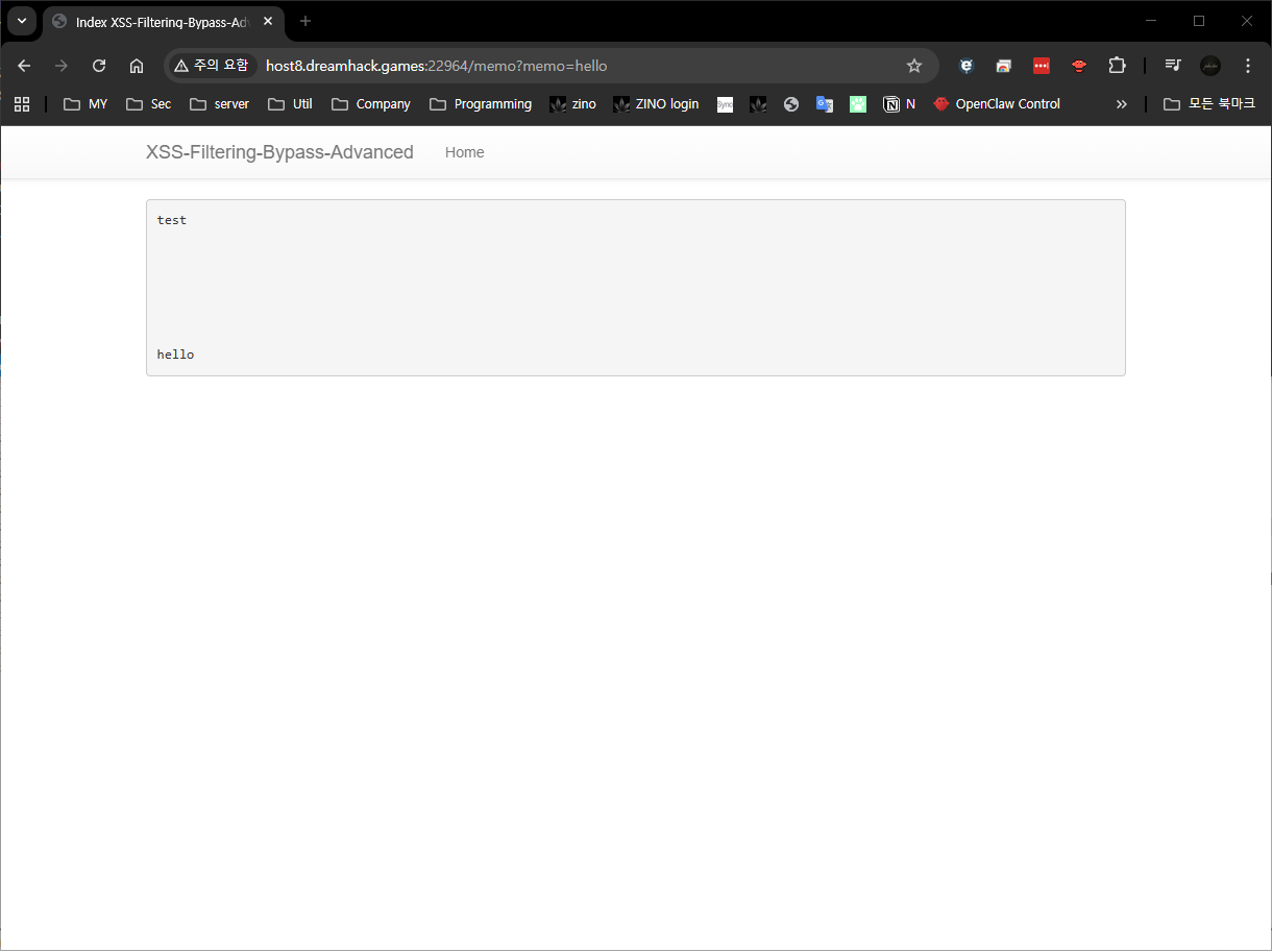 <iframe src='javas cript:locatio n.href="/memo?memo=test_ok"'>test_ok가 /memo에 남아있으면 iframe이 실제로 실행됐다는 증거다. 봇 트리거 전에 payload가 동작하는지 먼저 검증할 수 있다.