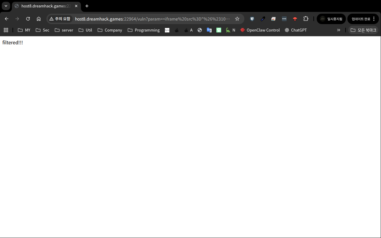 실제로 DH 서버에서도 <script>alert(1)</script>를 URL에 넘겨보면 주소창에 그대로 표시되고 filtered!!! 반환된다.