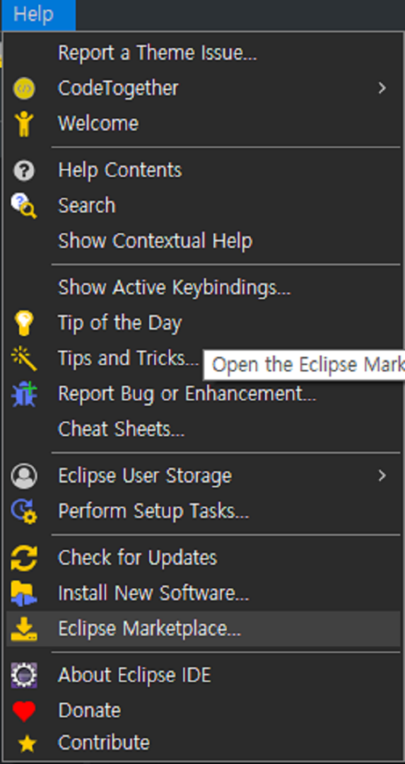 • "eclipse" 실행 후 좌측 상단 "Help" 클릭 이후 "eclipse Marketplace.." 클릭