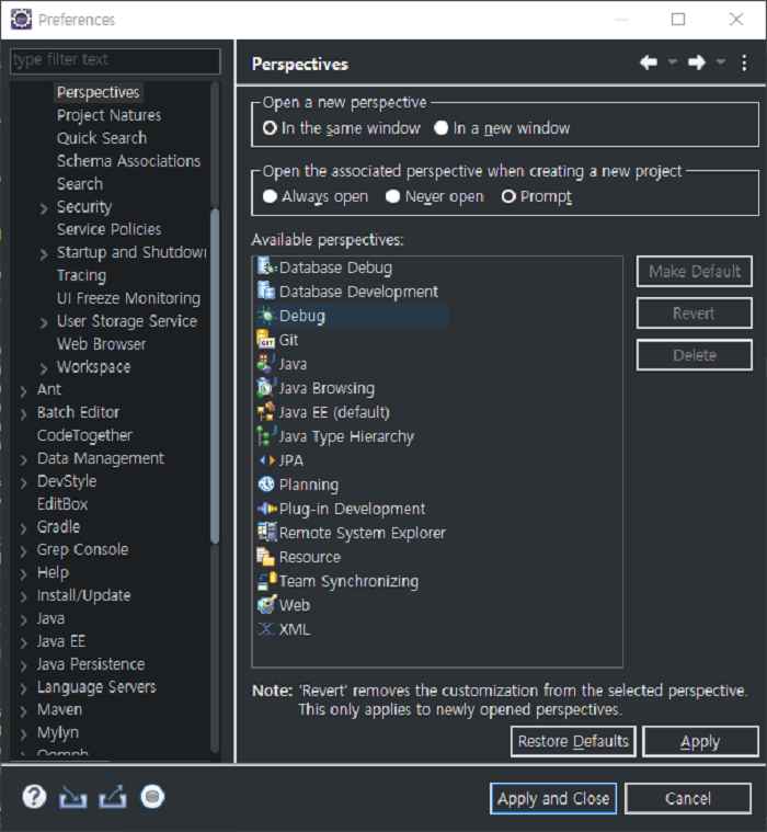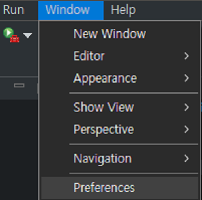 • 재시작 된 이클립스 좌측 상단 "Window" 버튼 클릭 후 "Perspecive" 클릭
