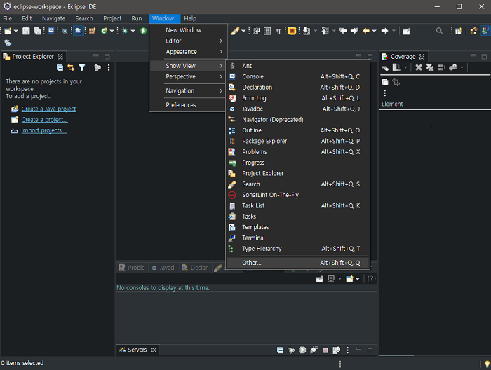 • 좌측 "Project Explorer" 항목에 "Remote Systems"가 아직 보이지 않으므로 좌측 상단 "Window -> "Show View" -> "Other" 버튼 클릭