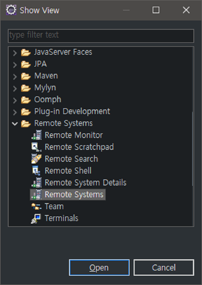 • "Remote Systems" 의 "Remote Systems" 선택 후 "Open" 버튼 클릭