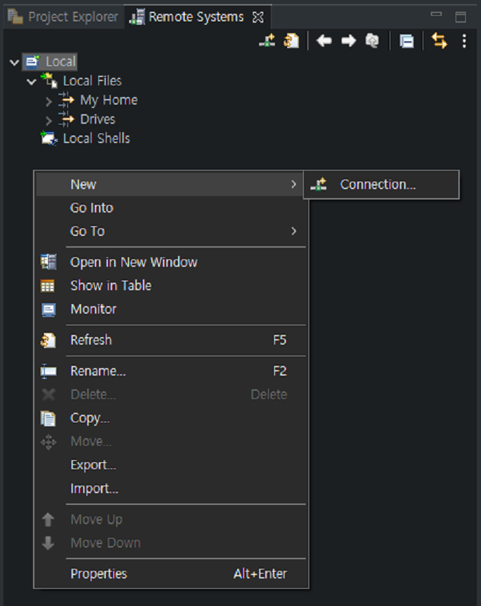 • 좌측 "Remote System" View 추가 확인 후 마우스 우클릭하여 "New Connection" 클릭