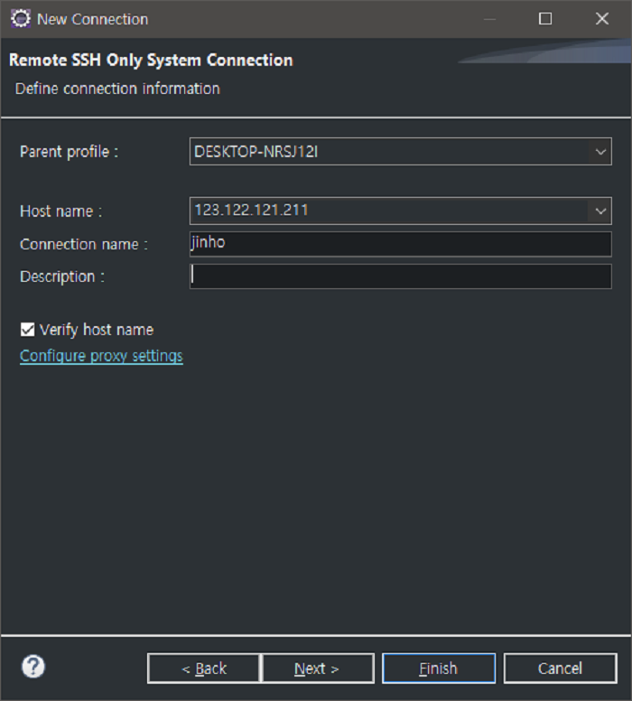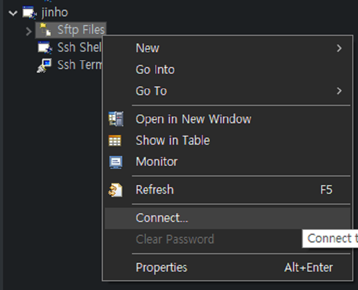 • "SSH Only" 버튼 클릭 후 "Next" 버튼 클릭 시 나타나는 창이다. "Host name" 에는 접속하려는 원격 접속지의 IP, "Connection name"에는 연결 이름 등을 작성한 후 "Finish" 버튼 클릭시 좌측 Viewer에 추가된 SSH 서비스를 확인할 수 있는데 "Sftp Files" 우클릭 후 "Connect" 버튼을 클릭하여 관련 설정을 해준다.