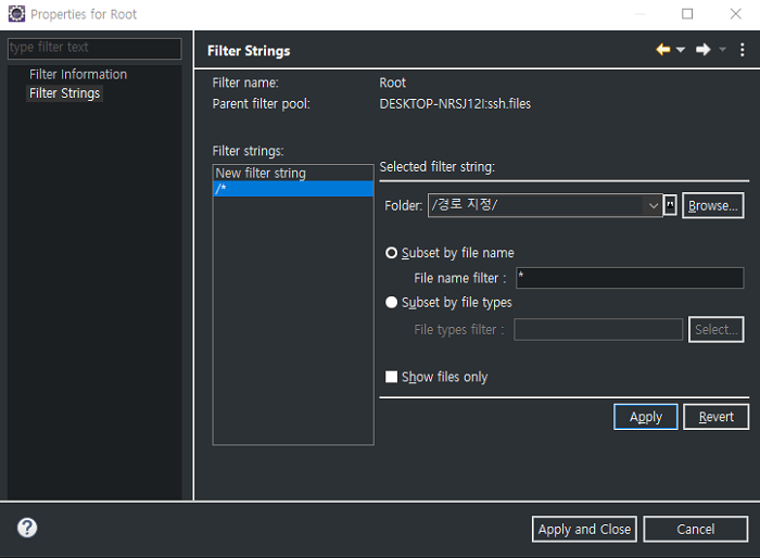 • "Filter Strings" -> "Folder" 에 경로를 지정해준다.