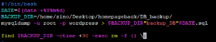 # mysqldump -u root -p wordpress > $BACKUP_DIR"backup_DB"$DATE.sql