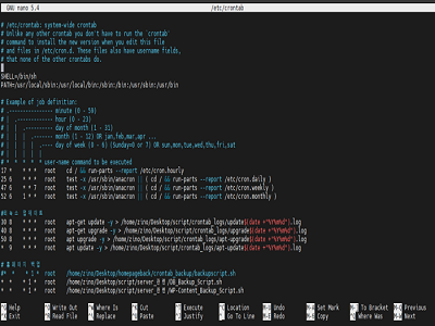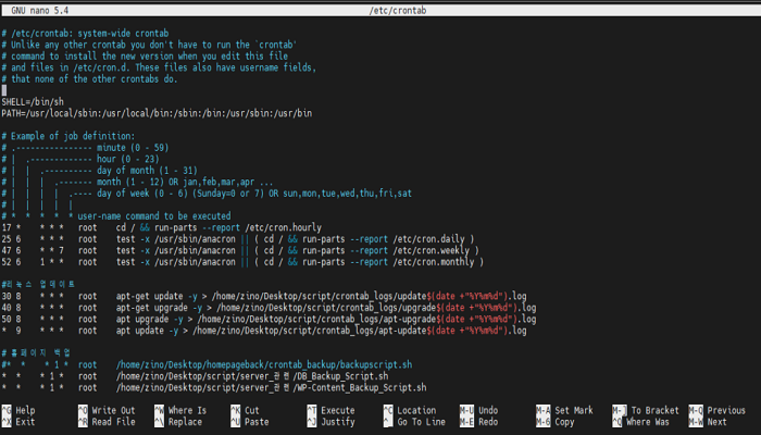 에디터 하단 하루 한번 백업 스크립트를 수행하라는 명령을 추가한 모습을 확인할 수 있고 control + X 키로 저장하고 빠져나오면 된다.