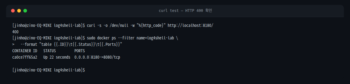 400 응답이 나오면 정상이다. Spring Boot 앱이 Content-Type 없이 오는 요청에 400을 반환한다.