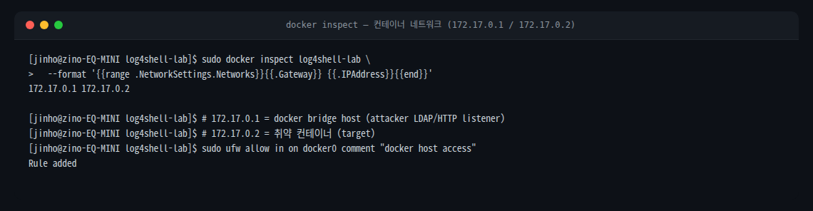172.17.0.1— Docker bridge의 호스트 쪽 IP (Metasploit 서버들이 바인딩할 주소)172.17.0.2— 컨테이너 내부 IP (공격 대상)